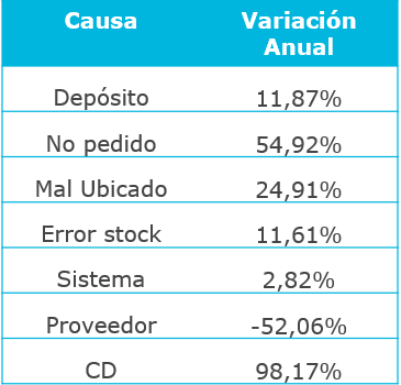 - No pedido: Los faltantes que no son pedidos en tiempo y forma. Son los casos que no se haya emitido una orden de compra; o que se haya emitido tardíamente. Para ello se ve el momento del quiebre y se compara con la fecha de la emisión de la orden de compra.